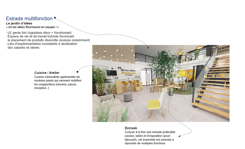 Le défi étant lancé, nous avons donc tous pris part au projet ; commerciaux et bureau d'études compris. La générosité des volumes nous ont permis de travailler à différentes échelles et niveaux de lecture pour ainsi exposer du mobiliers de bureaux, lounge et sur-mesure à travers des situations de travail et de pause. La tendance "work at home" fut le fil rouge de cet aménagement en proposant des environnements innovants répondant aux attentes du moment : l'équilibre vie professionnelle/vie privée. Cette philosophie s'inscrit dans le cadre du bien-être au travail (confort, espace personnel/collectif,...), de la performance managériale (productivité, fidélisation) et de la performance commerciale (mise en avant et mise en situation des produits).